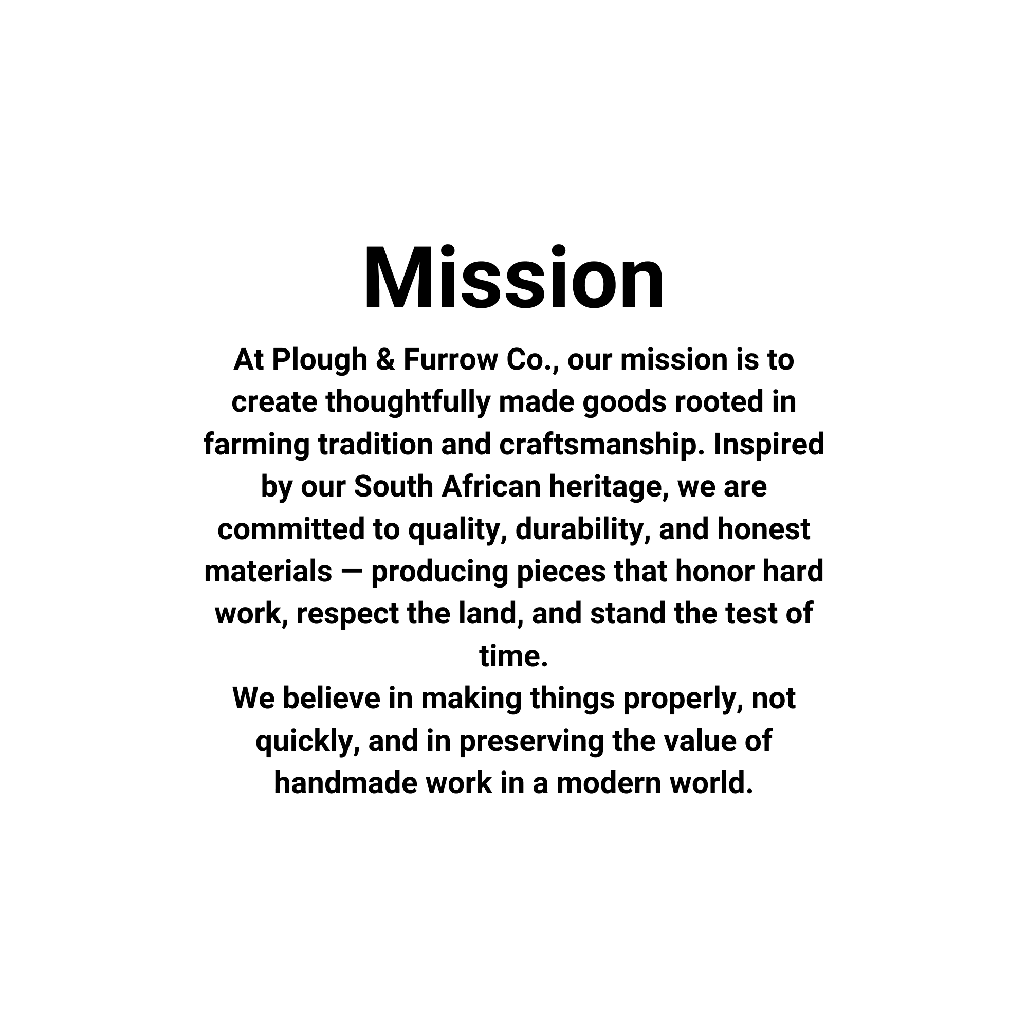 At Plough & Furrow Co., we believe in handmade quality, honest materials, and thoughtful design. We focus on pieces that are practical, durable, and timeless — made to be used, worn, and lived with, not rushed or replaced. Our work reflects the balance between tradition and modern living, honoring the past while fitting seamlessly into today’s world.